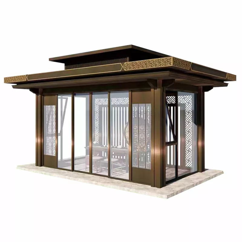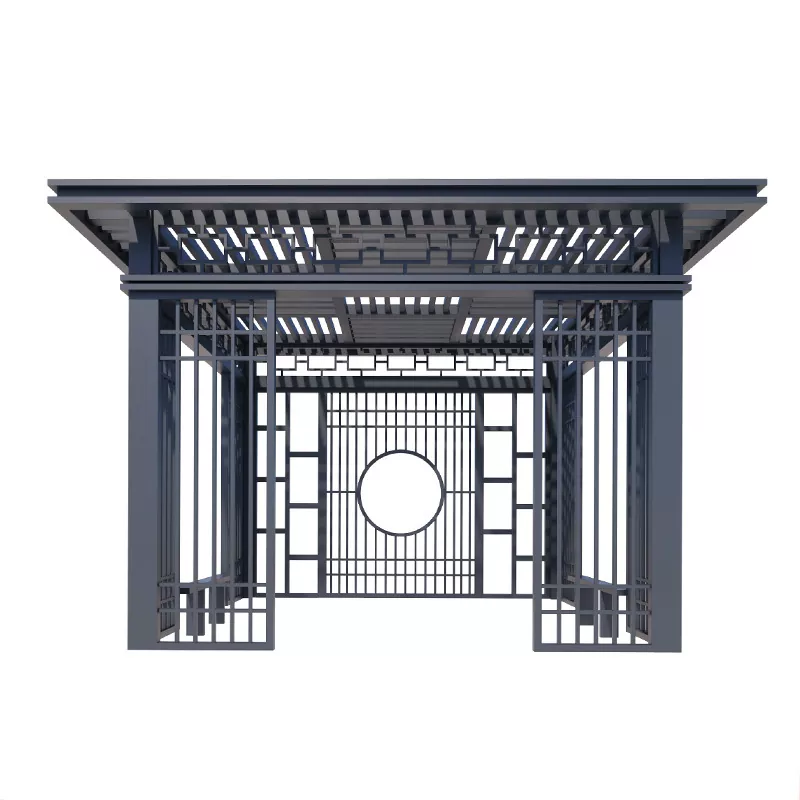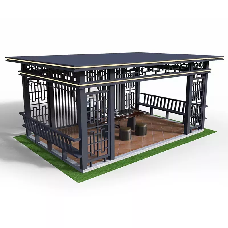 Courtyard Leisure Pavilion (3000×3000mm): cột 80×80mm, mái ngói xanh nhỏ, lưới treo chạm khắc đơn giản, thích hợp cho sân riêng;