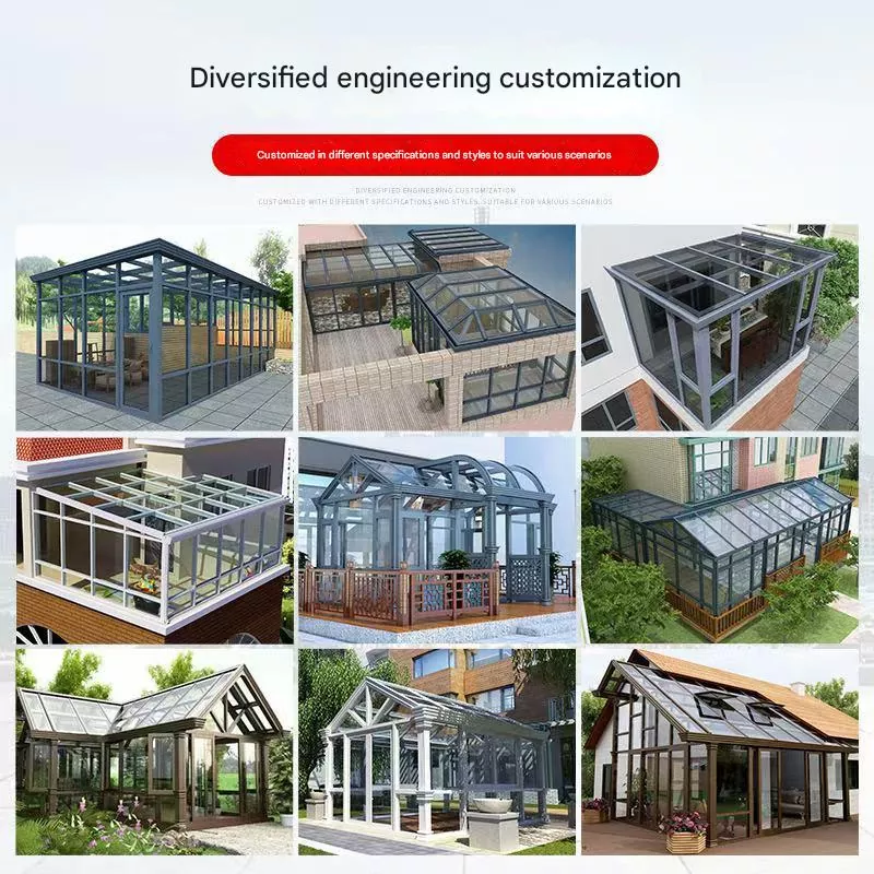 Phòng tắm nắng sử dụng một khung nhôm cách nhiệt + kết cấu kính cường lực cách nhiệt. Khung bao gồm các cột, dầm và các giá đỡ chéo, được lắp ráp thông qua một hệ thống mô-đun hỗ trợ nhiều kiểu mái, bao gồm mái đầu hồi, mái bằng và mái cong.